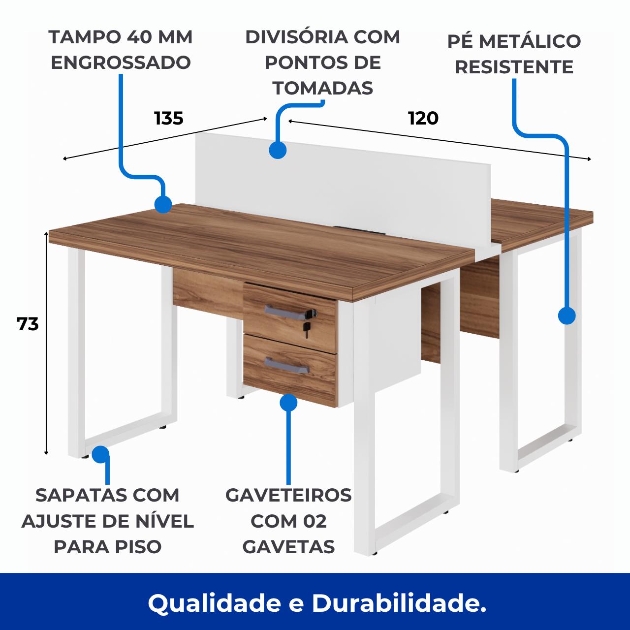Estação de Trabalho Dupla 1,20×1,35m com Gaveteiro e Tomada – Pé Quadro
