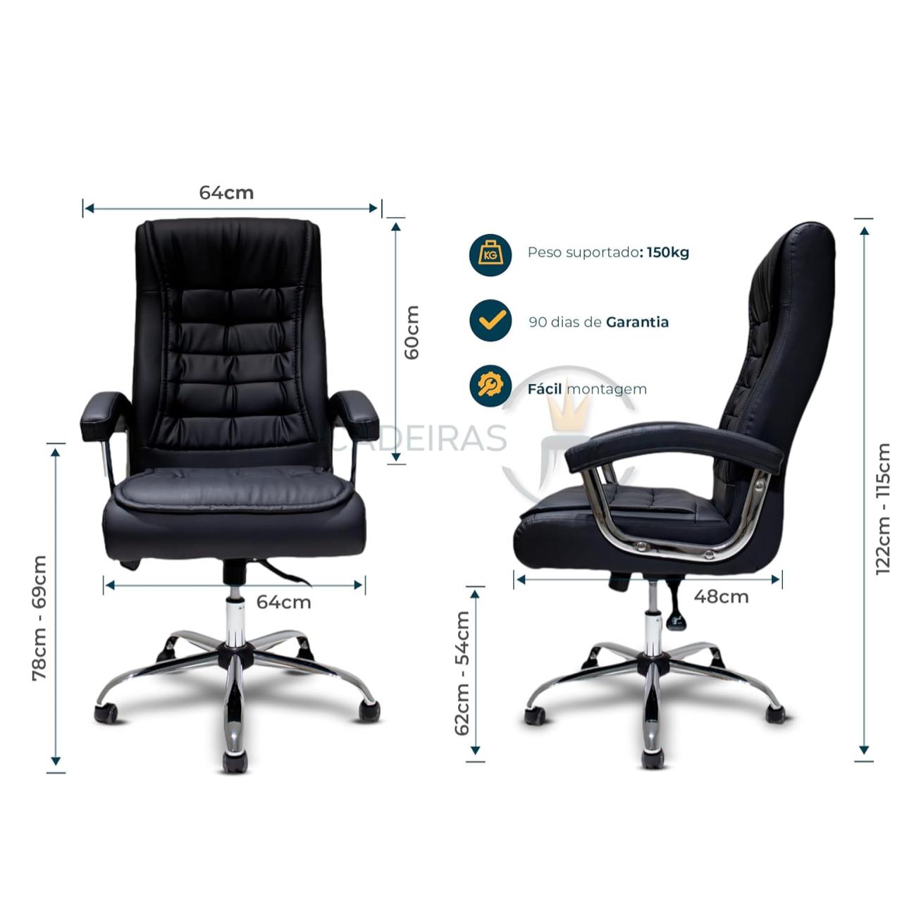 Estilo executivo sofisticado, com acabamento em couro sintético de fácil conservação.